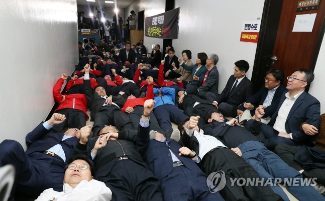 (¼¿ï=¿¬ÇÕ´º½º) ±èÀÎö ±âÀÚ = ÀÚÀ¯Çѱ¹´ç ÀÇ¿øµéÀÌ 29ÀÏ ¿ÀÈÄ ±¹È¸ Á¤Ä¡°³ÇõƯÀ§°¡ ¿¸± °ÍÀ¸·Î ¿¹°íµÇ¾ú´ø ±¹È¸ º»Ã» 4Ãþ ÇàÁ¤¾ÈÀüÀ§¿øÈ¸ º¹µµ¿¡¼ Á¤ÀÇ´ç ÀÇ¿øµéÀÌ Áö³ª°¡Áö ¸øÇÏ°Ô ´©¿ö¼ ±æÀ» ¸·°í ÀÖ´Ù. Á¤Ä¡°³ÇõƯÀ§´Â Àá½ÃÈÄ 6Ãþ Á¤¹«À§ ȸÀÇÀå¿¡¼ ¿·È´Ù. 2019.4.30