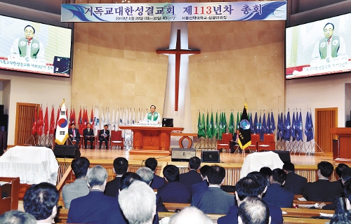 °³È¸¿¹¹è¿¡¼´Â ¹ÚÁ¾Ã¶ ±âµ¶±³Çѱ¹Ä§·Êȸ(±âħ) ÃÑȸÀå µî ±³°èÀÇ ÁÖ¿ä Àλ簡 Âü¼®ÇØ Ãà»çÇß´Ù. ¹Ú ÃÑȸÀåÀº ¡°Çѱ¹±³È¸ ¿¬ÇÕ»ç¾÷¿¡ Àû±Ø Âü¿©ÇÏ´Â ±â¼º ÃÑȸ ÀÓ¿øÁø¿¡ ±íÀº ÀλóÀ» ¹Þ¾Ò´Ù¡±¸ç ¡°¾ÕÀ¸·Îµµ Çѱ¹±³È¸°¡ Çϳª µÇ´Â µ¥ ÇÔ²² Èû¾²ÀÚ¡±°í Ãà»çÇß´Ù. ÇüÁ¦ ±³´ÜÀÎ ¿¹¼ö±³´ëÇѼº°á±³È¸(¿¹¼º) ¹®Á¤¹Î ÃÑȸÀåÀº Ãà»ç¿¡¼ ¡°´ëÇѱ⵶±³³ª»ç·¿¼º°á±³È¸´Â Áö³ÇØ, ¿¹¼º ÃÑȸ´Â Áö³ÁÖ¿¡ ±³´Ü ¸íĪÀ¸·Î ¡®Çѱ¹¼º°á±³È¸¡¯¸¦ »ç¿ëŰ·Î °áÀÇÇß´Ù¡±¸ç ¡°¼º°á º¹À½ È®»ê¿¡ ½Ã³ÊÁö¸¦ ³¾ ¼ö ÀÖµµ·Ï ±â¼º ÃÑȸ¿¡¼µµ ¸íĪ °øµ¿»ç¿ë¾ÈÀ» ´ë½ÂÀû Â÷¿ø¿¡¼ ´Ù·ï´Þ¶ó¡±°í ´çºÎÇß´Ù.