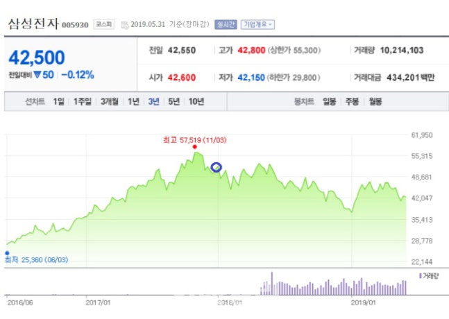 | »ï¼ºÀüÀÚÀÇ ÃÖ±Ù 3³â °£ ÁÖ°¡ È帧. ÆÄ¶õ»ö ¿øÀÌ ±è±â³² ºÎȸÀåÀÇ ÀÌÀü ÀÚ»çÁÖ ¸ÅÀÔ ½ÃÁ¡. (ÀÚ·á=³×À̹ö ±ÝÀ¶) |